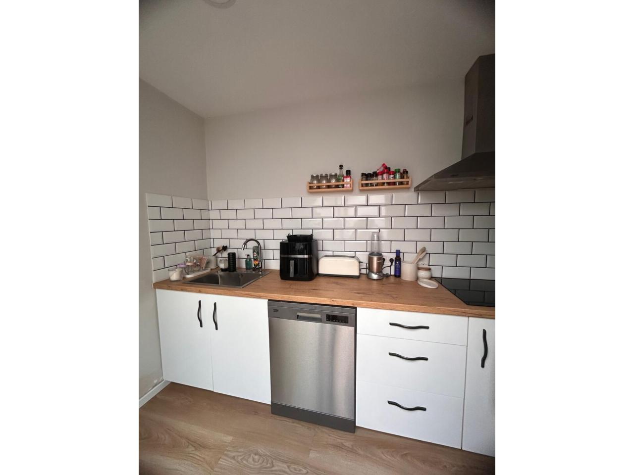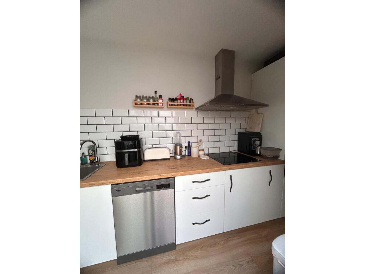 La cocina, moderna y de diseño, está equipada con acabados de gran calidad y también tiene salida directa al patio, creando un espacio funcional y muy cómodo.
